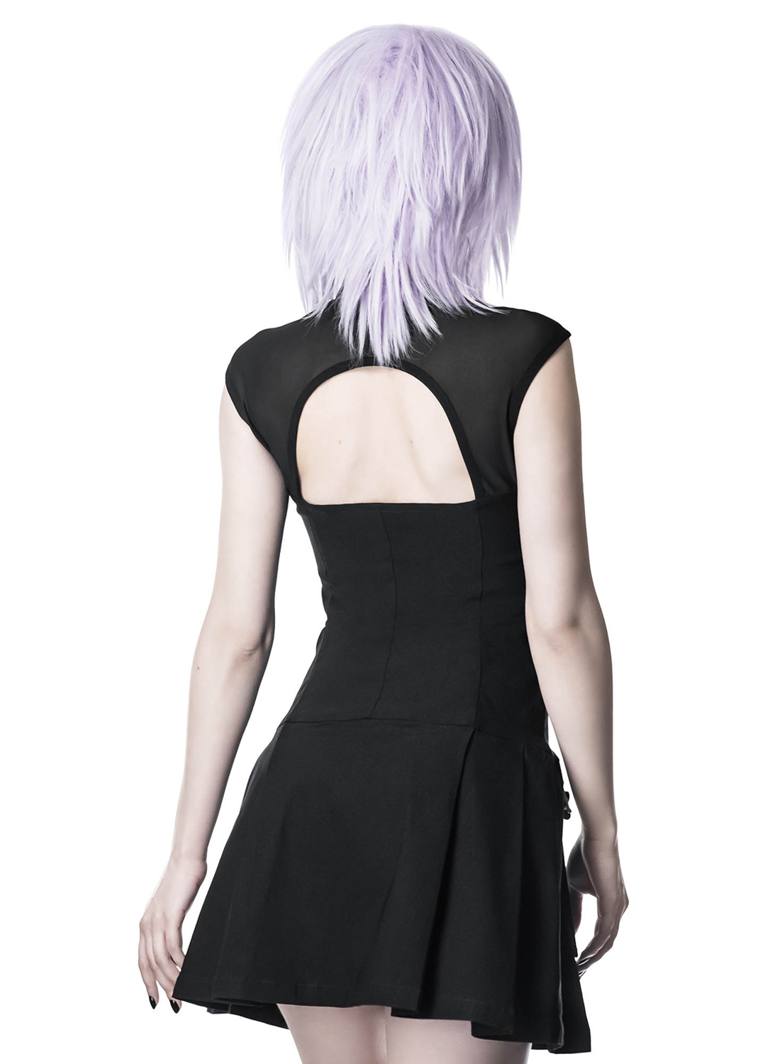 Killstar Amplified Skater klänning . Stretchtyg med ett kraftigt meshtyg, hög halsringning med knappstängning och korta ärmar.