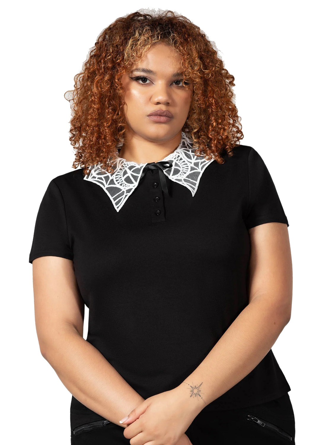 “Apprentice” topp är mångsidig och lätt att styla; med mjukt stretchiga tyg, för fantastisk komfort och passform. Vit spetskrage med pentagram motiv, korta ärmar. Perfekt för alla dagar i veckan!
