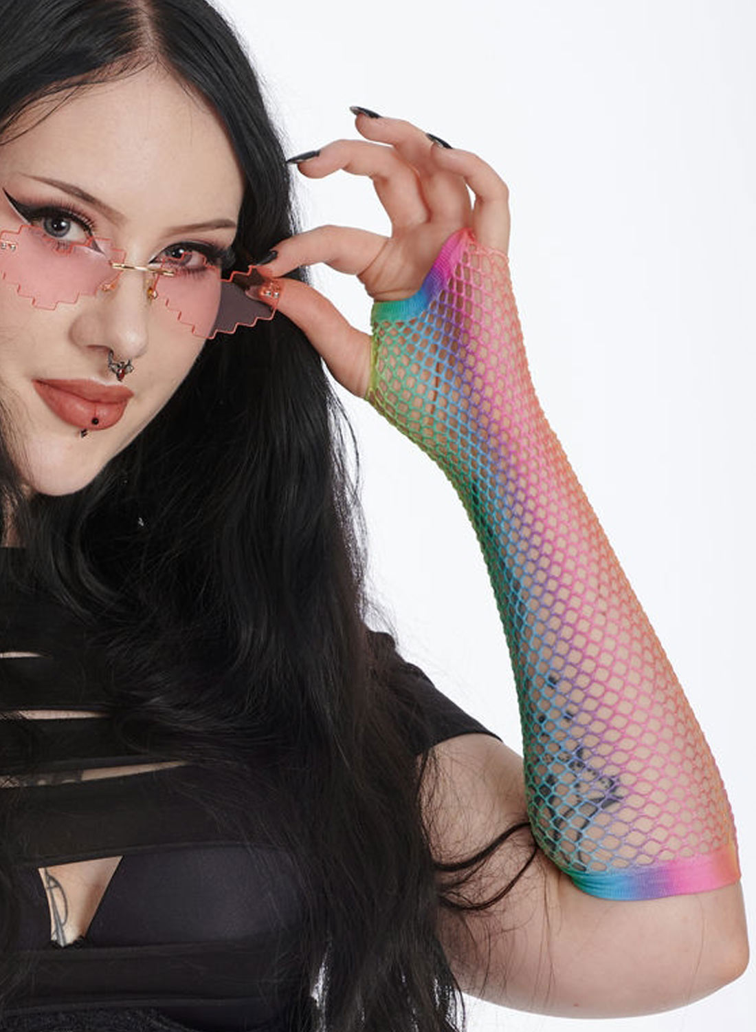 California Love Gloves är den perfekta detaljen som sätter pricken över i’et på din alternativa klädstil! Rainbow färger, långa, fingerlösa handskar i snyggt fishnet från Banned!