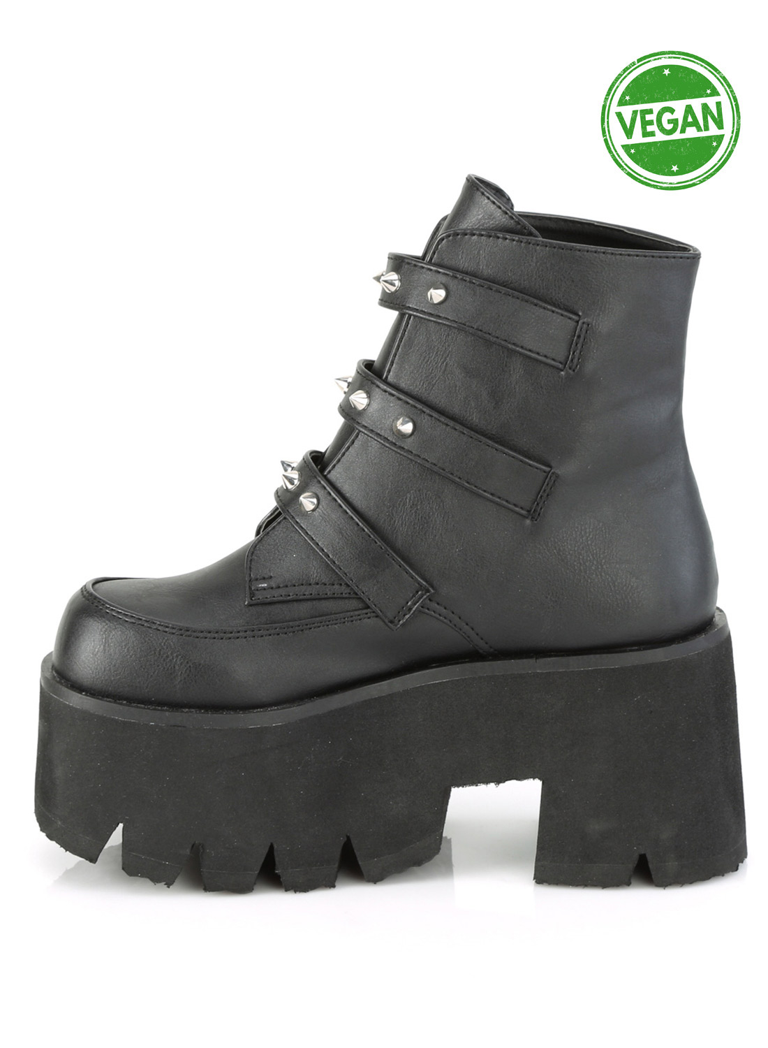 Demonia Ashes-55 Black är vegan skor/ boots från Demonia. 5,7 cm plattform och 9 cm klack. Utskuren plattformskänga med 3 dubbade fladdermusspänne.