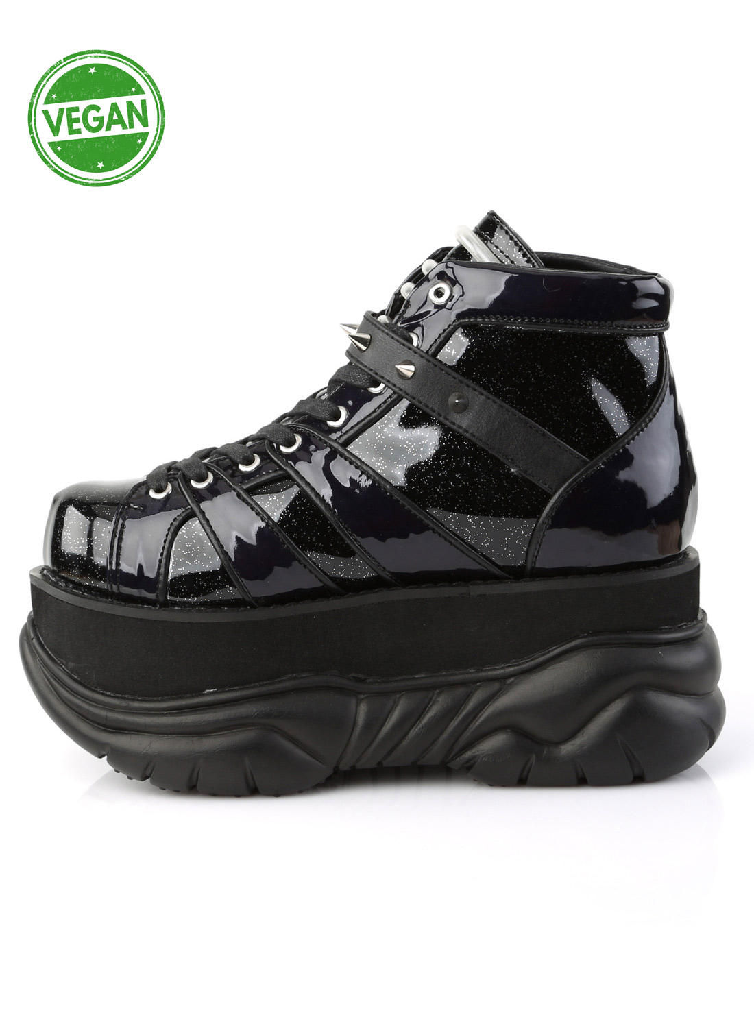 Demonia Neptune-100 är vegan  skor/ boots från Demonia. 7,6 cm plattform med snörning på framsidan, ögle ankelrem med nitar och UV-reaktiva remmar på ovansidan av skon.