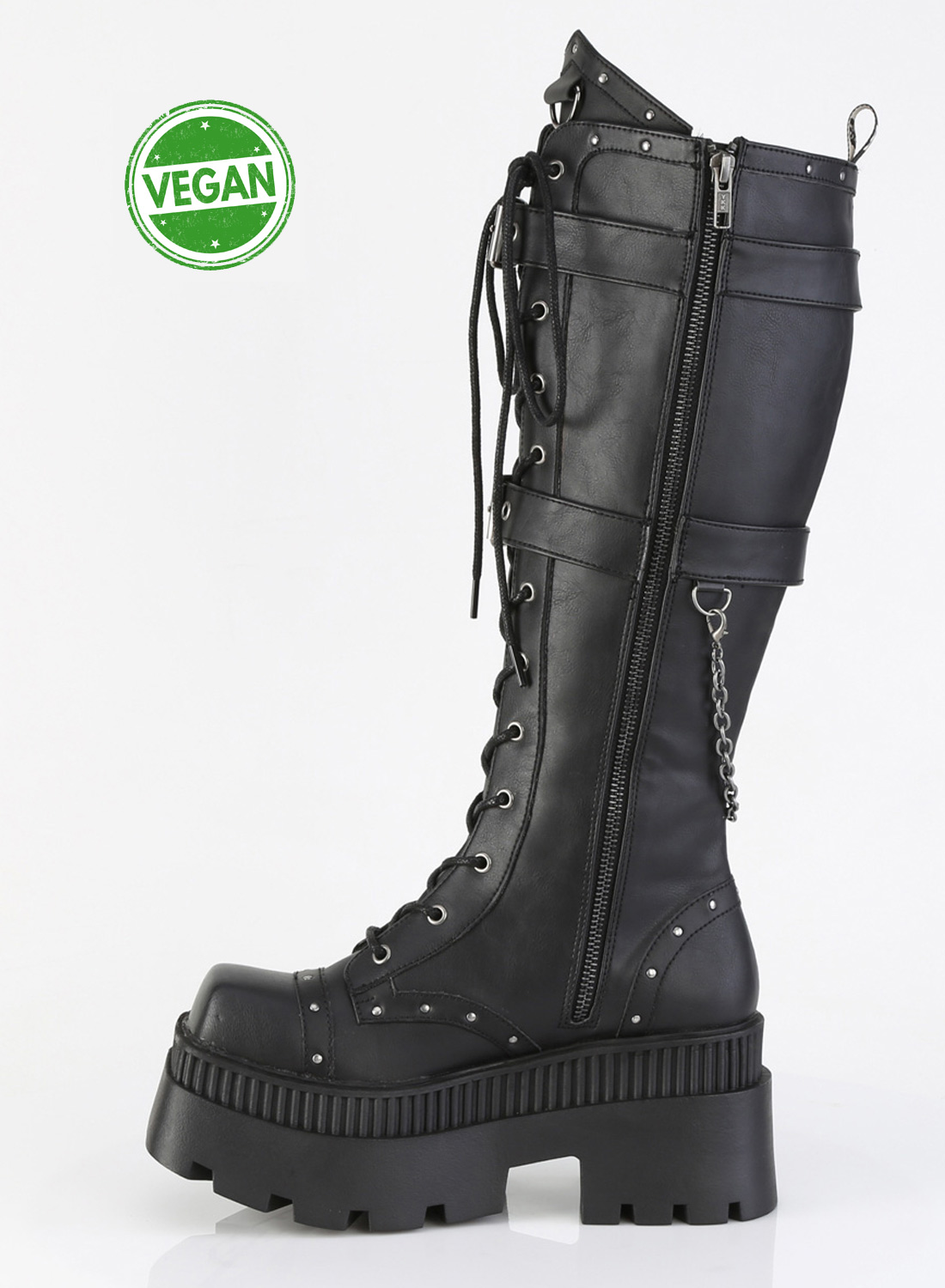 Demonia Wrath-205 är vegan skor/ boots från Demonia. 5,1 cm plattform och 8,3 klack. med snörning på framsidan, dragkedja i full längd. Knähög känga med sidoficka med D-ring & döskallehanddekorationer & hängande kedjedetaljer och all-over nitdetaljer.