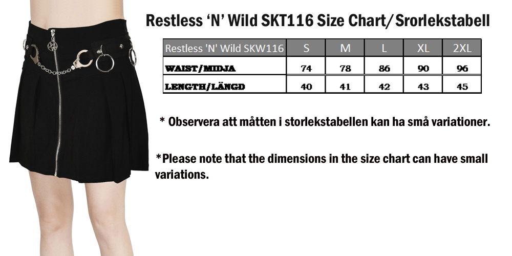 Gothic glam skirt är en supersöt kjol från Restless ‘N’ Wild. Stretchigt tyg med dragkedja framtill och hängande pentagram. Bältesdetaljer i kanvas med nitar- och o-ringar framtill och på baksidan handklovar