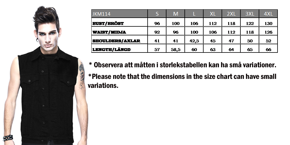 Denna klassiska jeansvästen är i svart denim och har 2 bröstfickor för förvaring. Knapparna på västen är i Svarta med döskalle och sömmarna är svarta 2 sidofickor samt innerfickor.. Modellen är en regular fit.
