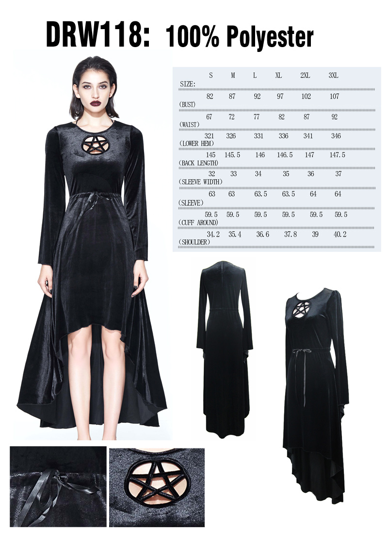 Morticia,  klänning från Restless ‘N’ Wild. En fantastiskt vacker klänning tillverkad i stretchig sammet med pentagram dekoration framtill. Sidenband i midjan för bättre passform.