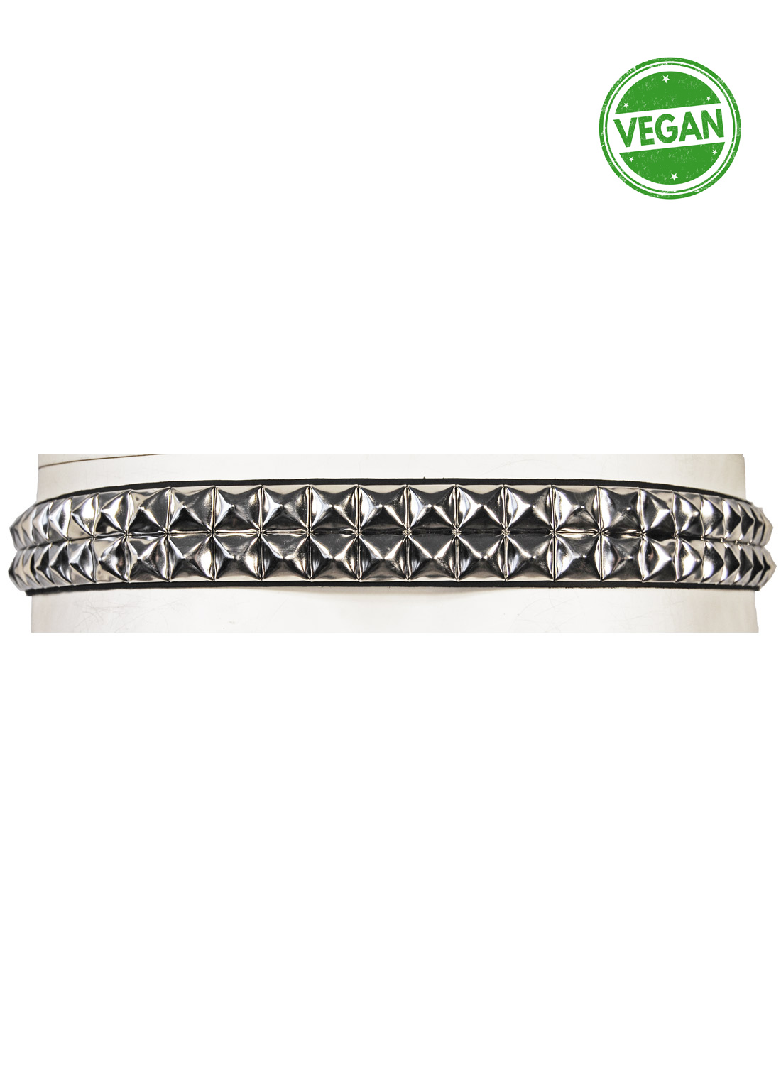 Pyramid 2 Row Vegan Belt är ett 2- radigt pyramid-nitbälte i vegan läder. Bredd: 3,8 cm. Detta svarta nitbälte kommer från Randomizer. Bältet är unisex och passar lika bra på han, hon och hen!