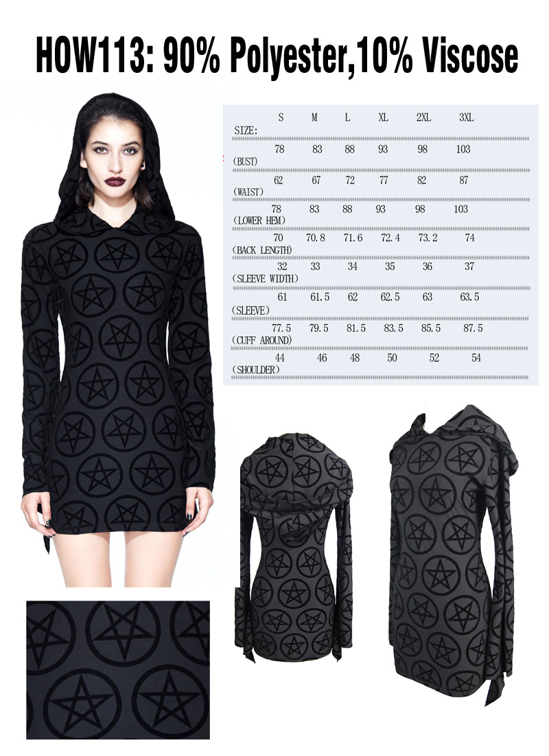 Vampirela penta hood/klänning från Restless ‘N’ Wild. Lyxig mjuk stretchjersey för en smickrande och förförisk passform. Överdimensionerad huva, långa och vida ärmar med svarta pentagramtryck. Den här klänningen är perfekt för en dejt med djävulen. Åh så mångsidig – perfekt från skymningen till gryningen. Ser fantastisk ut med -klackar+netstrumpor + en choker – mixa och matcha som ditt mörka hjärta önskar!