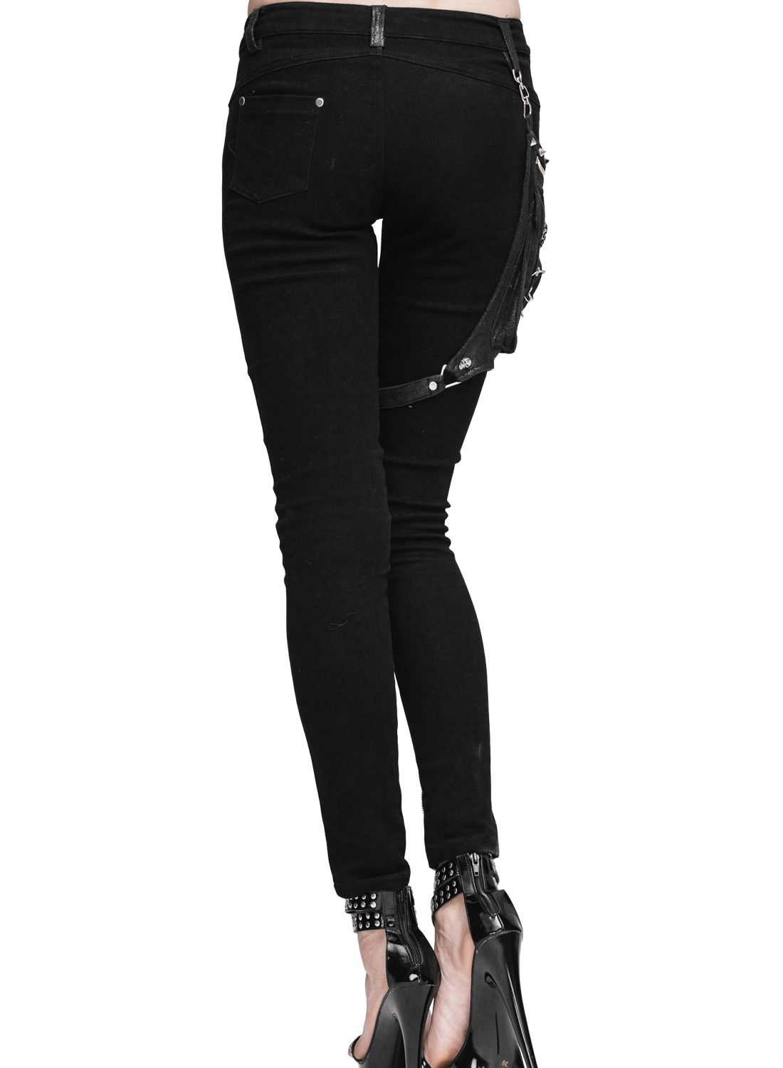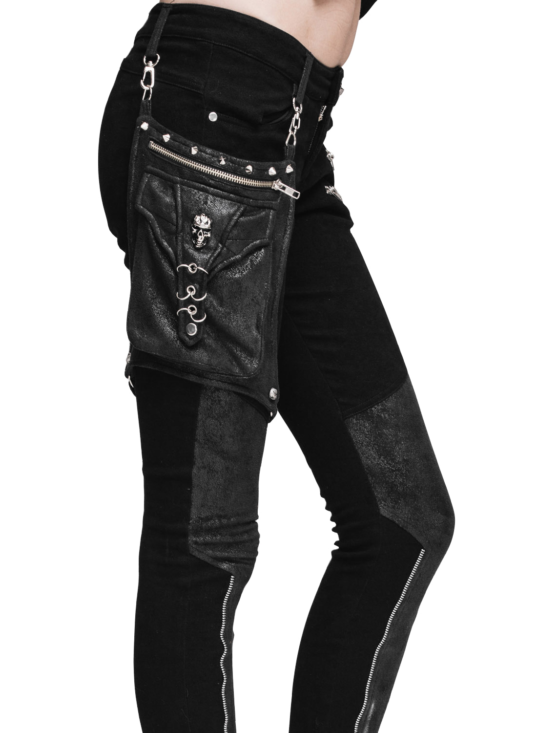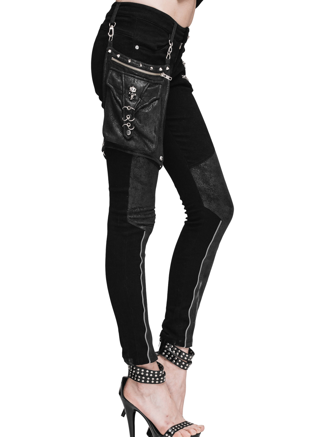 Praktiska och snygga byxor i punkrockstil med inlägg i konstläderlook och dekorativa dragkedjor på ben och höfter. Två framfickor och en bakficka ger plats för dina småsaker, och den fantastiska avtagbara benfickan/ väskan i konstläderlook ger extra förvaringsutrymme – så att du garanterat har händerna fria medan du dansar! Väskan är dekorerad med nitar och silverringar, vilket också gör den till en visuell höjdpunkt.