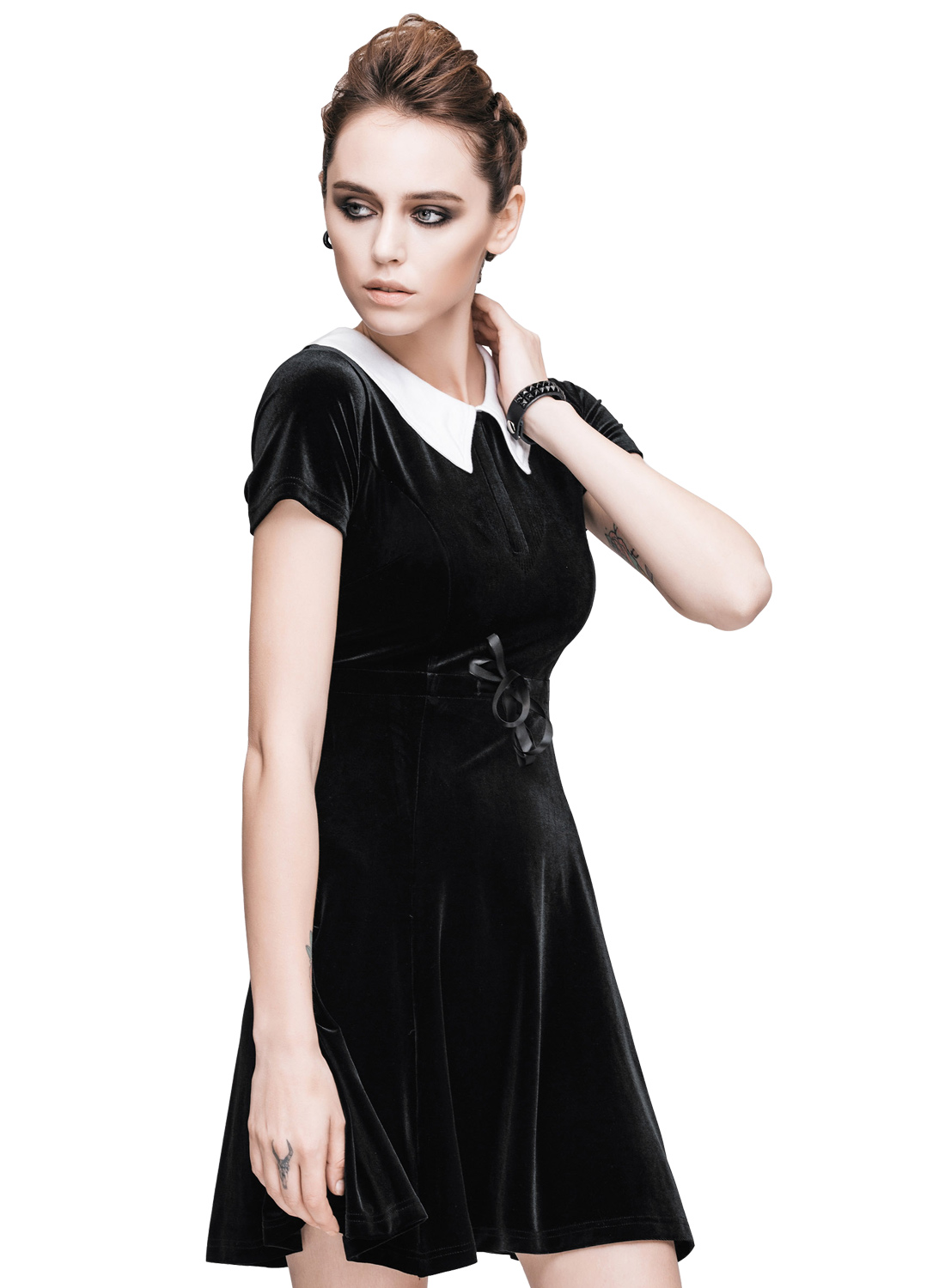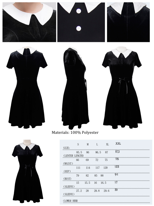 Wednsday, Klänning från Restless ‘N’ Wild. En fantastiskt vacker klänning tillverkad i stretchig sammet med vit krage och dragkedja i ryggen. Sidenband i midjan för bättre passform.